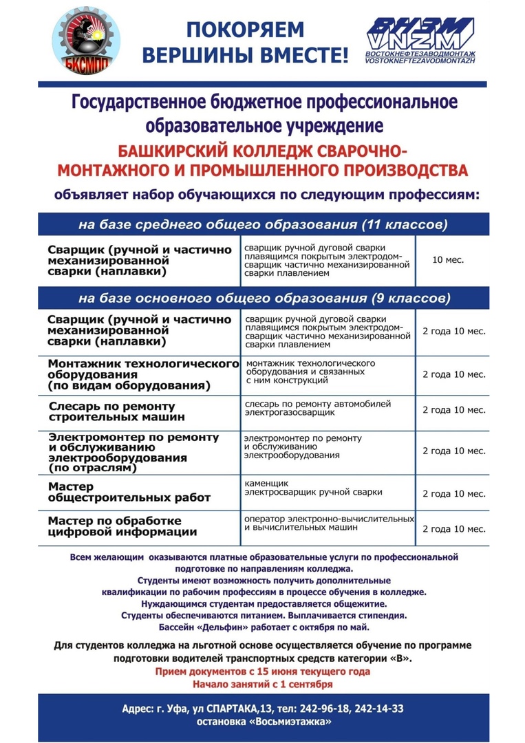 ГБПОУ Башкирский колледж сварочно-монтажного и промышленного производства приглашает на учебу выпускников 9 и 11 классов.