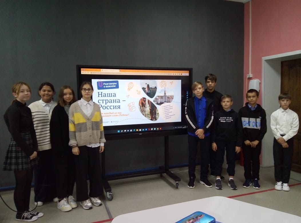 Первый урок в понедельник еженедельно - занятия «Разговор о важном». В 1-2 классах оно было посвящено теме: «Где мы живем?» Главной задачей является воспитание гражданственности, любви к своей стране, гордости за свое Отечество. В 3-4 классах урок был проведён по теме «От поколения к поколению: Любовь россиян к родине». Цель урока: воспитывать у обучающихся третьих-четвертых классов ценностное отношение к нашей Родине – России, принятие идеи о действенной любви к Родине, которая проявляется в добрых делах в отношении близких, малой и большой Родины; формировать гражданскую идентичность, воспитывать гордость за Отчизну. В 5-7 классах урок был посвящён теме «Что мы Родиной зовем?».